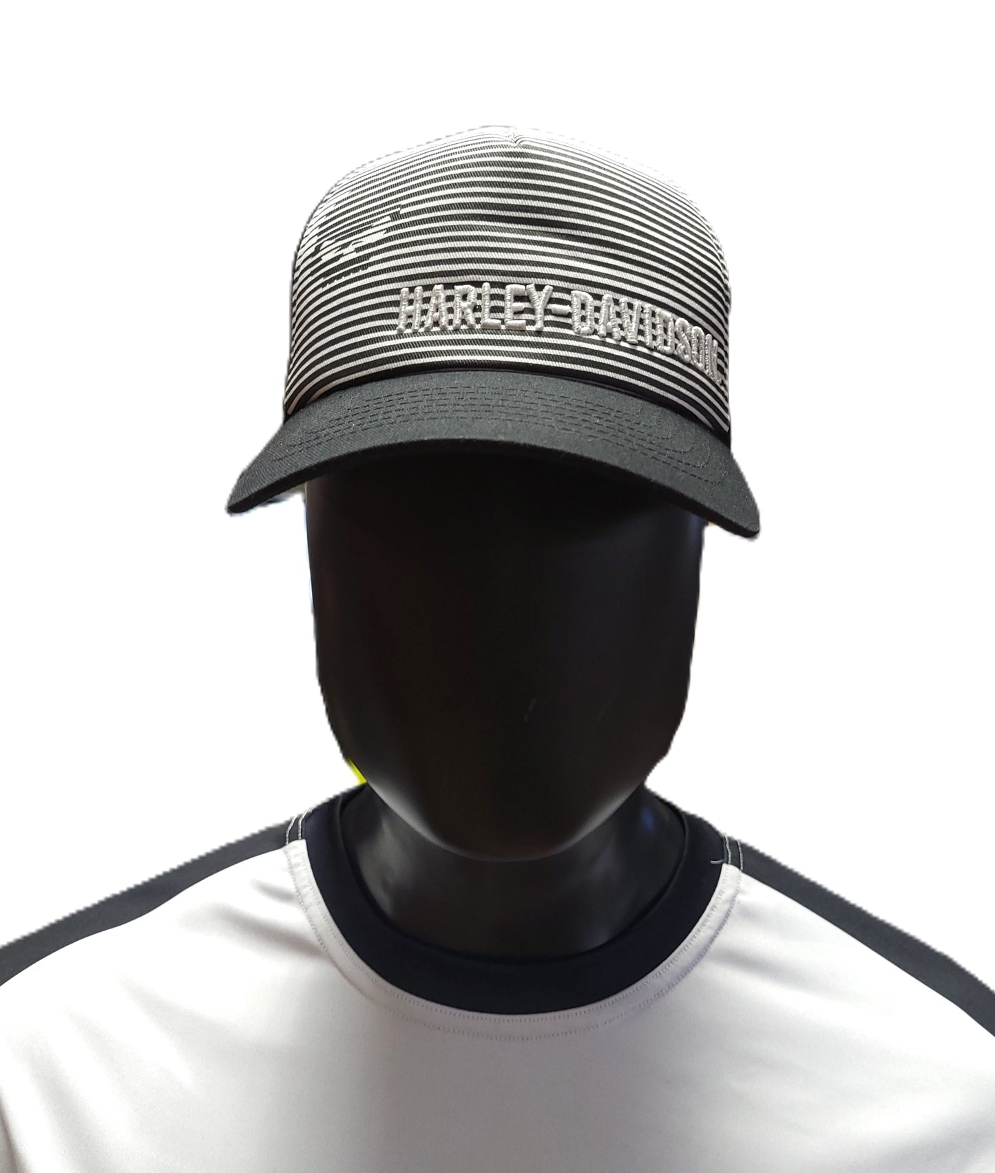 This striking Black & White striped baseball-style trucker cap is made from resilient and comfortable cotton. This cap features the Harley-Davidson® brand Willie G Skull on front and on the back, our custom embroidered House of Harley-Davidson® script, punctuated with the Milwaukee, WI connection affiliating you with the oldest & largest dealership in the city where it all started. One size fits most. Bravado