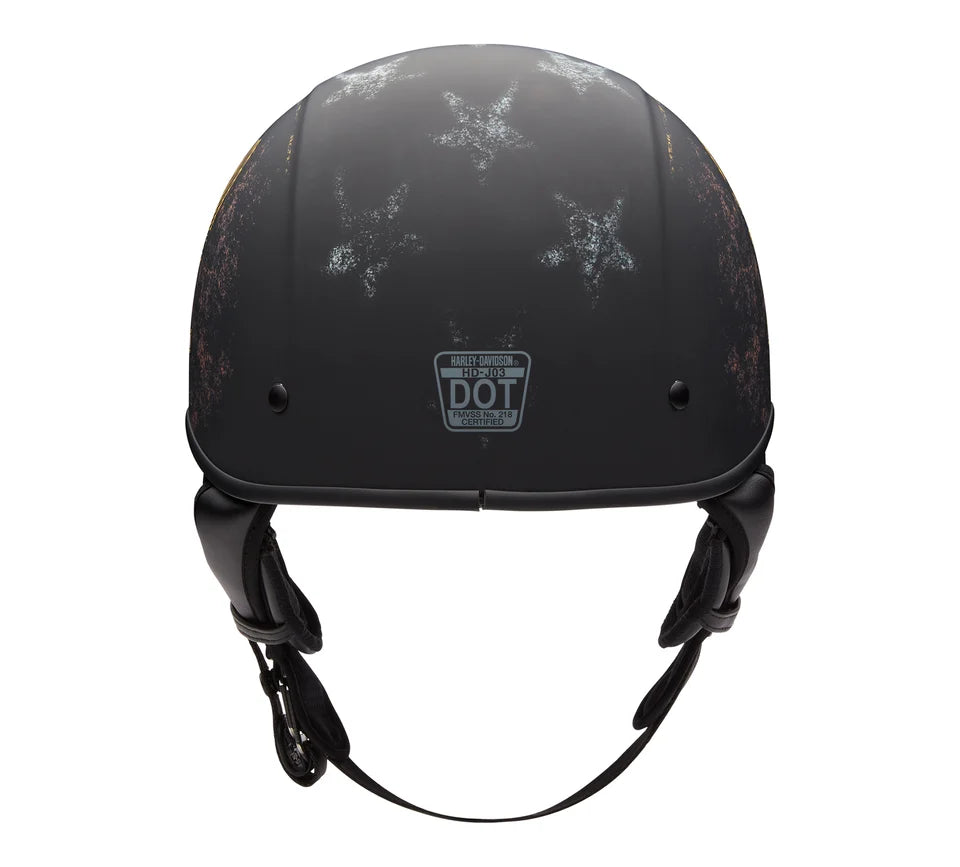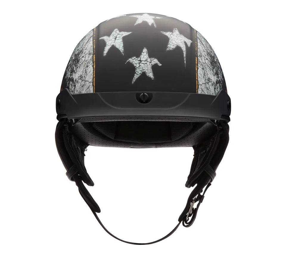 Soaring throwback style goes all-in on this rider favorite. The H-D® Busby Ultra-Light Sun Shield J03 ½ Helmet has a fiberglass and Spectra fiber shell that provides maximum strength with minimum weight. It has a removable visor and retractable sun shield that deliver UV and anti-scratch protection. This motorcycle helmet meets DOT standards, and features zip-off speaker pockets so you stay connected for navigation, favorite road tunes, and hands-free calls. Its Matte Black finish is surrounded with distressed-looking custom artwork inspired by our archives. Stay up to speed with its specs below, then order yours while supplies last.