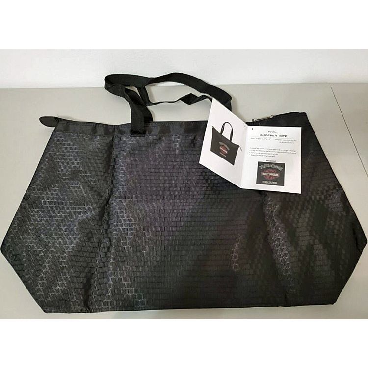 Take this bag with you whenever you travel. Whether you're headed to the local Farmers' Market or boarding a plane out of state, the H-D® Shopper Tote should be along for the trip. This large, durable, light-weight bag completely collapses, making it an easy travel companion. The fully lined interior ensures maximum protection of your treasures enroute. And, the extra-wide zip-top opening gives you convenient access, while the sturdy woven handle fits comfortably over your shoulder. The familiar black-on-black honeycomb pattern from The Tail of the Dragon Series adds interest and complements the Harley-Davidson® Motorcycles signature that frames the iconic Bar & Shield® logo. Be ready for anything, everyday, with the strong polyester construction and the graphics that reflect your active lifestyle. Measures approximately 19.5"W x 12.5"H x 7.7"D. Black. Polyester. Athalon®