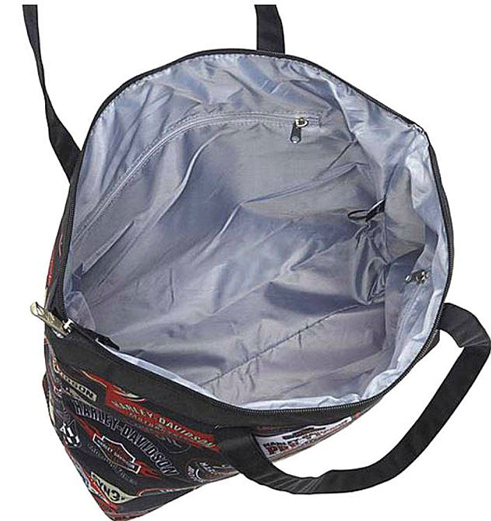When you're out on the go, bring the large & convenient H-D® Vintage Tote and shop 'til you drop. This fully-lined shoulder bag takes the demands of the day in stride and makes a great travel companion for a quick overnight stay. Made from light-weight polyester, this tote offers an extra-wide zip-top opening that leads you to a generous interior. And, the vintage Harley-Davidson® logos convey your loyalty and lifestyle. Measures approximately 19.5"W x 12.5"H x 7.5"D. Black. Polyester. Athalon®