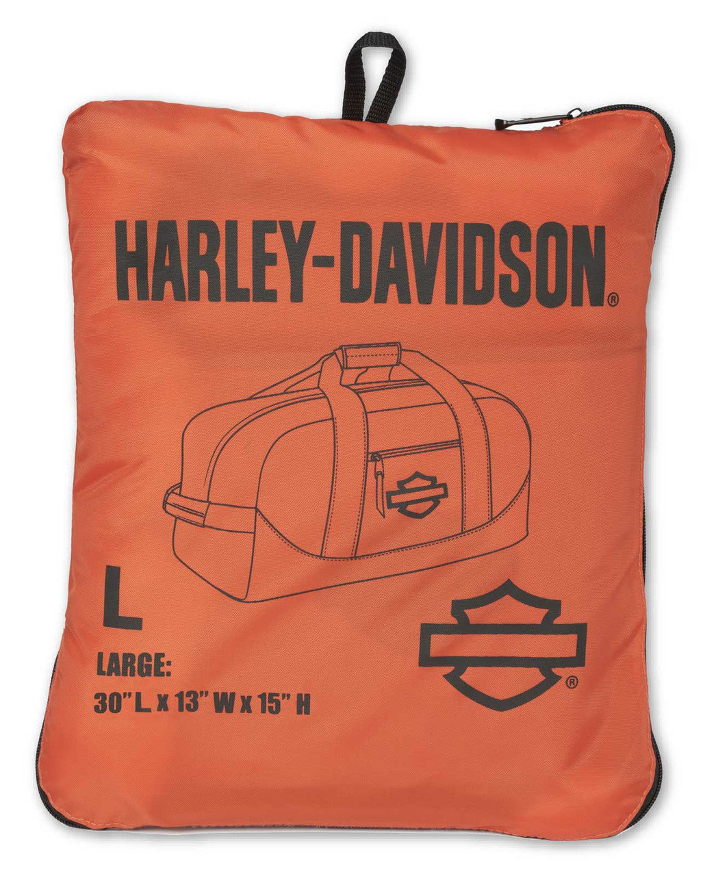 Harley-Davidson® Rugged High-Density Nylon Dura-Duffel Duffel - Orange. Made from rugged, high density nylon. Reinforced bottom for greater durability. Comfort grip handle, and strap. Exterior front zippered pocket for quick access to personal items. Pouch included for convenient storage when not in use. 3D embroidered classic bar & shield logo. 96L capacity. Size: 30" x 15" x 13".