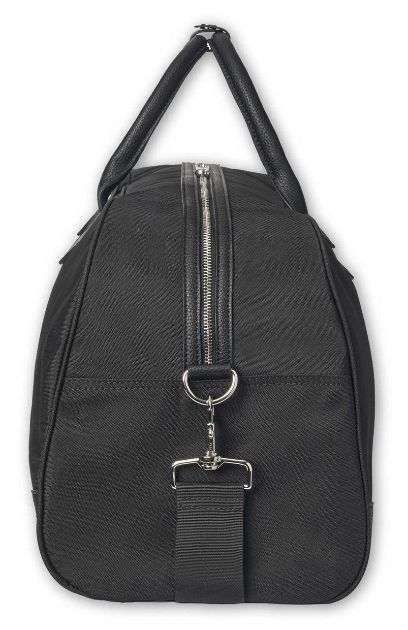 Harley-Davidson® Women's Studded Duffel Bag, Moonshadow Black 90831-MOON. Durable exterior with stylish silver studs and leather trim. Roomy, lined main compartment. Multiple ways to carry with double handles and removable adjustable shoulder strap. Made from fashionable polyester. 3D scripted H-D logo. Size: 22" x 12" x 10".
