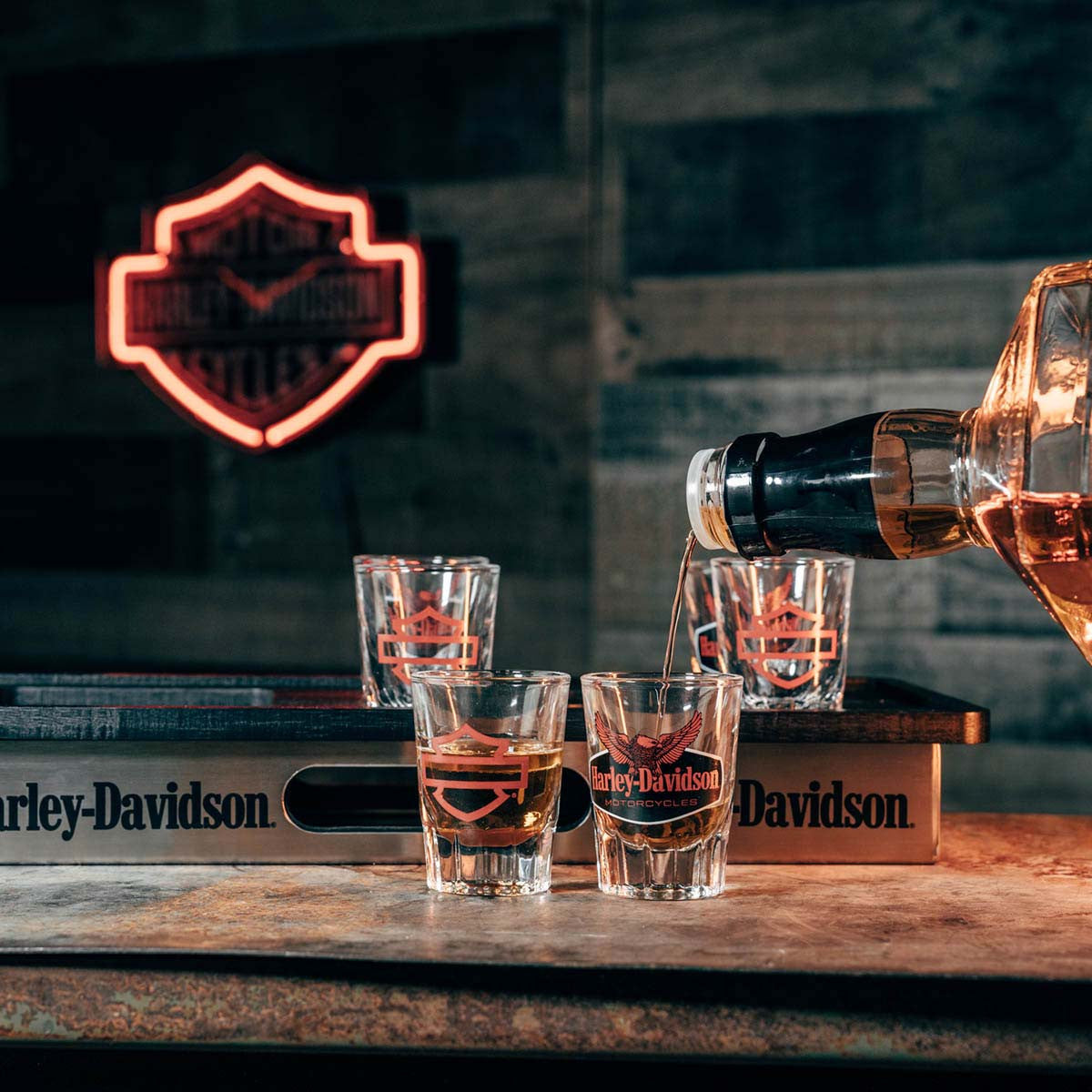 - Set includes six 2 oz. / 60 ml heavy base shot glasses (three with Harley-Davidson eagle graphic and three with Blank Bar & Shield logo)