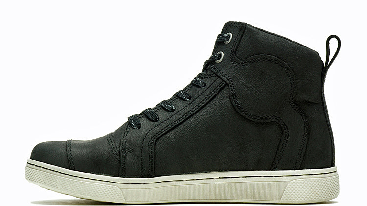 Every new iteration of the Bateman Riding Sneakers Collection adds an opportunity to express your priorities. From color and shaft height to performance and comfort features, the Bateman Group distinguishes itself with an essential street-smart appeal, offering room for individual interpretation. Start with the requisite full-grain leather upper and full-length mesh lining, and check out the detailed follow-through, including an ankle protection insert (not shown) to maximize your time in the saddle and the convenient pull-on loop to facilitate an easy on/off experience. The eye-catching reflectivity from the laces enhances your safety, as the slightly distressed rubber outsole promotes a citified look and the cement construction provides dependable footing. The Bateman Riding Sneaks lace-up like an updated running shoe, but make no mistake. The Bateman is not about walking. Or running. It's about riding. The branding graphics include the embossed Bar & Shield® logo at the top of the tongue and the V-Twin® metallic badge at the outside ankle. Rider smarts with urban savvy. This is the hybrid you've been waiting for. Shaft height: 4.50". Heel height: 1". Black. Leather. Wolverine. D84656