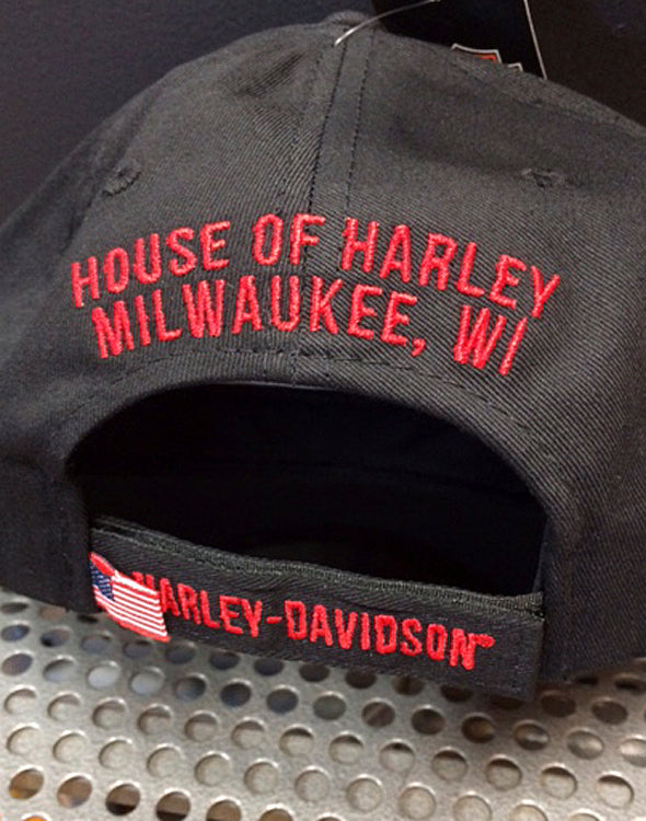 Rescue yourself from cap fatigue when you update your style from the sea of sameness to our exclusive H-D® Custom Embroidered Bar & Shield® Baseball Cap. Made from comfortably soft pure cotton, this cap delivers an adjustable fit that provides personalized perfection for wear-me-all-day ease. The black-on-black precision embroidery on front features the Bar & Shield® silhouette framing the Harley-Davidson® brand name along with contrasting fire-red piping to define the bill, while the fire-red State of Wisconsin outline embroidery appears on the side and the fire-red House of Harley® Milwaukee, WI embroidery customizes the back -- along with the Harley-Davidson® script on the adjustable VELCRO® Brand fasteners peeking out from behind the Old Glory woven tag to complete the look. And it's smokin' hot! One size fits most. Black/Fire Red. Cotton. Bravado