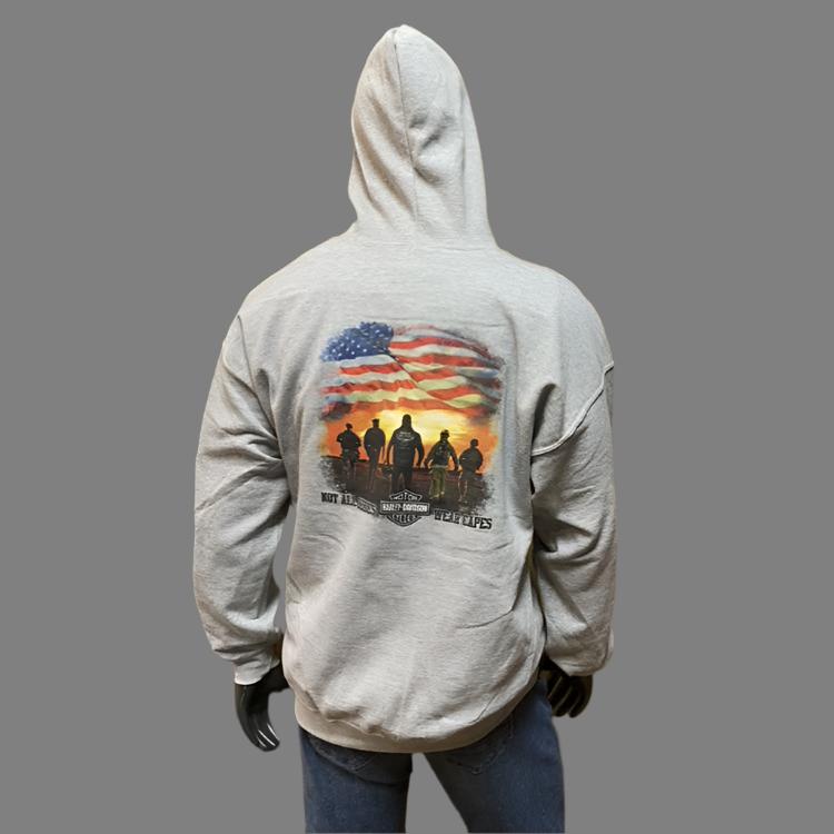 - The custom print graphics on the front of this traditional grey hoodie display a slightly distressed but ever-glorious American flag with the House of Harley-Davidson® signature, the Bar & Shield® silhouette and the Milwaukee, USA locator; while the graphics on the back display Old Glory waving over a sunset horizon showing military and first responders, the Bar & Shield® and the declaration: Not All Heroes Wear Capes