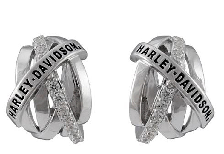 Sterling silver setting features a criss-cross pattern of ear-hugging hoops including a rhinestone wrap and another with the Harley-Davidson® signature. Butterfly-back post earrings. MOD® Jewelry