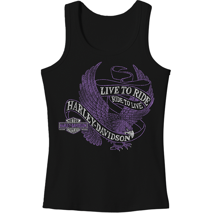 Women's black tank top featuring a purple eagle holding a banner that reads "Harley-Davidson, Live to Ride, Ride to Live." The Bar & Shield logo is also displayed to the side. On the back, a Bar & Shield Harley-Davidson logo with geometric wings is paired with the words "Freedom Machines." "House of Harley-Davidson" sits above, while "Milwaukee, USA" with stars anchors the design below.