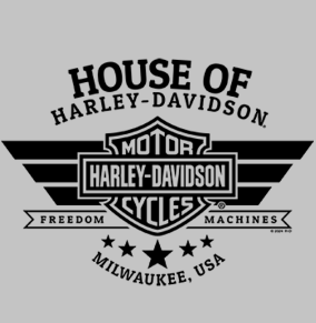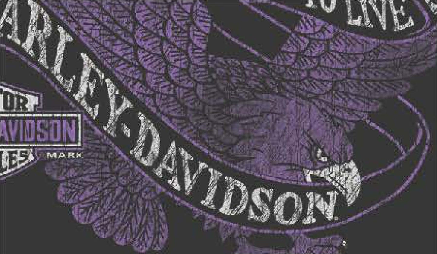 - Graphics: Purple eagle with "Harley-Davidson, Live to Ride, Ride to Live" banner, Bar & Shield logo on the side. Bar & Shield logo with geometric wings, "Freedom Machines," "House of Harley-Davidson," and "Milwaukee, USA" with stars on the back.