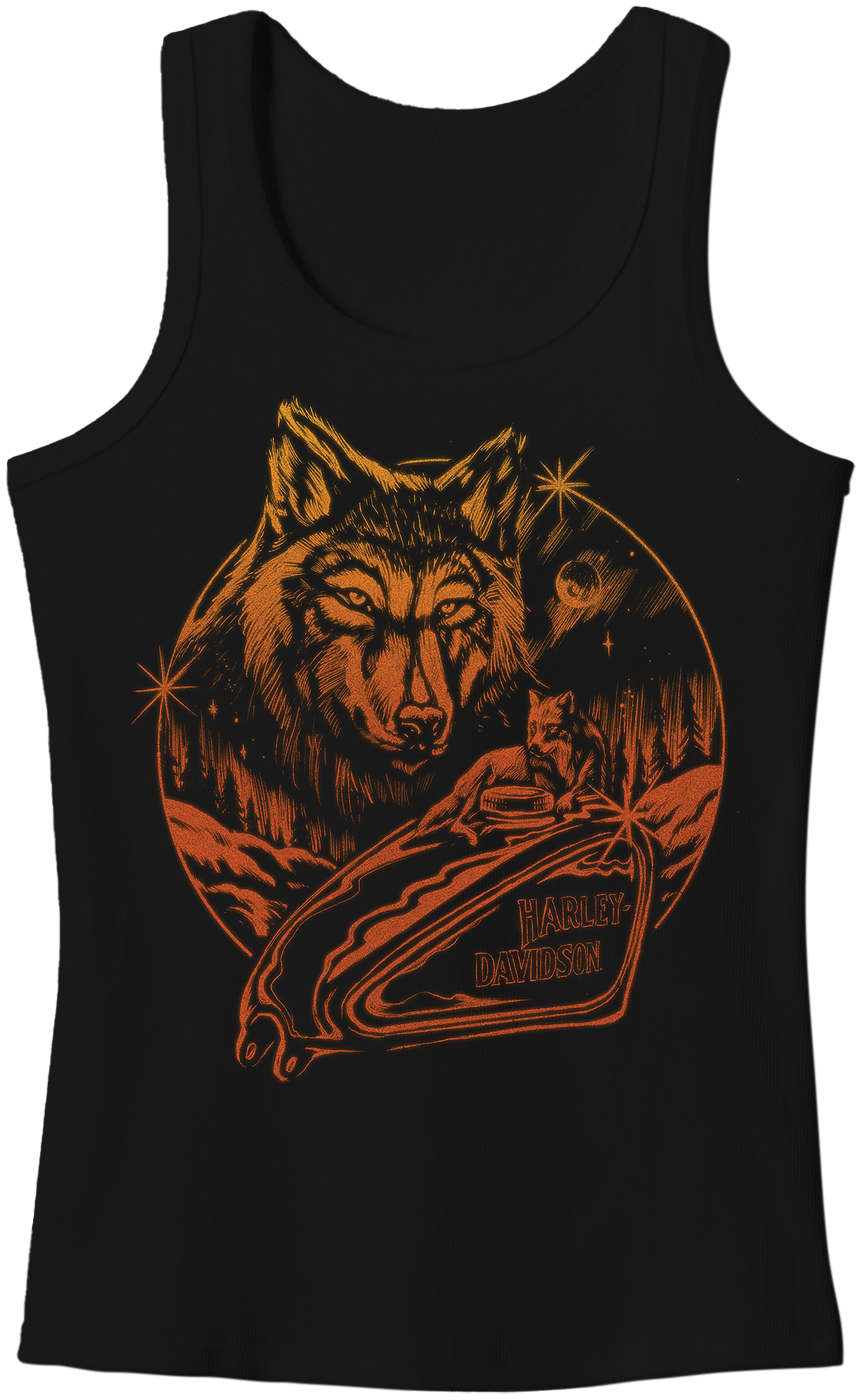 - Graphics on the front of this black tank top feature a wolf scene and a Harley-Davidson® tank, while the back features our dealership, House of Harley-Davidson®, in oil can graphics