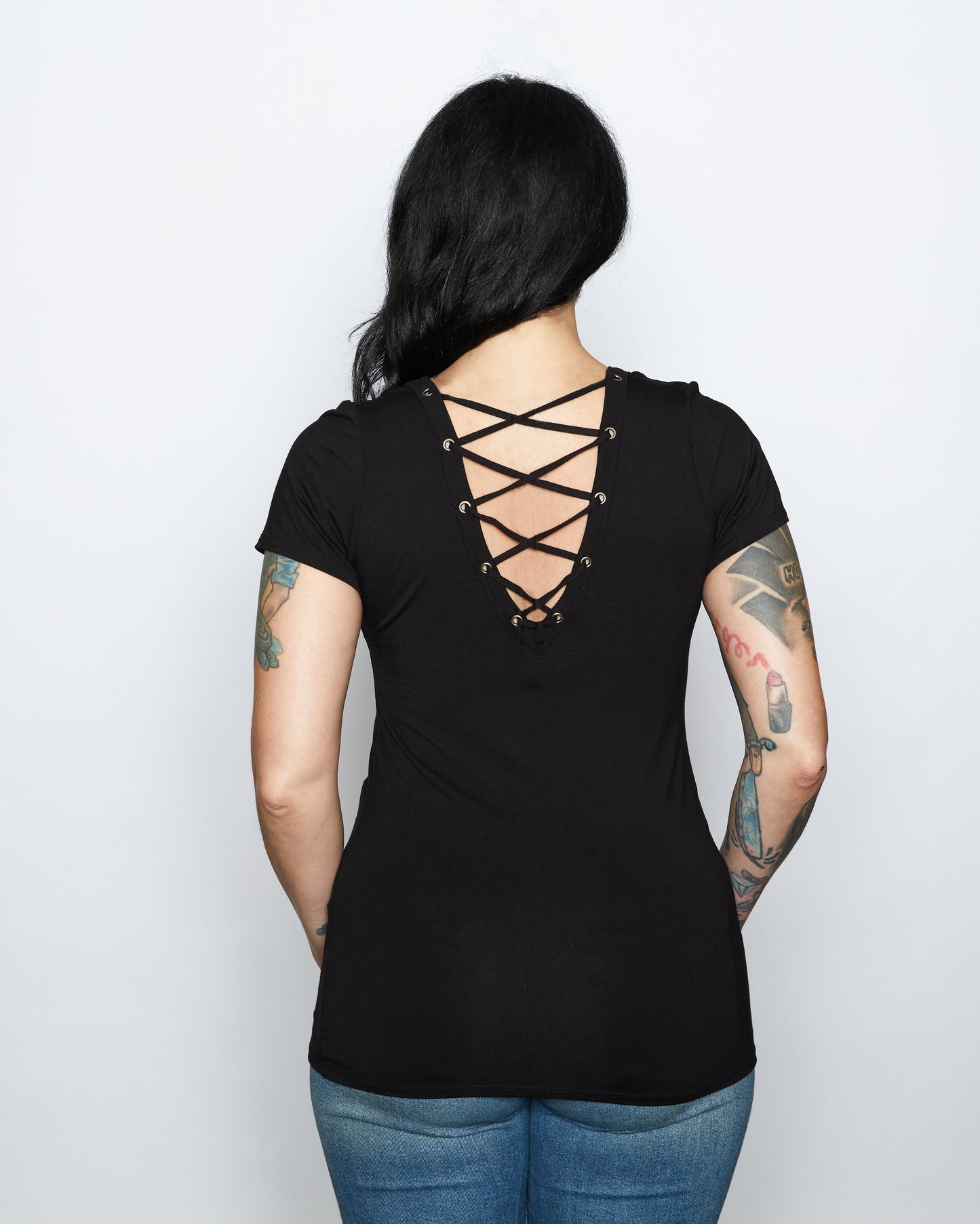 - V-neck design features lace-up, open-back detailing