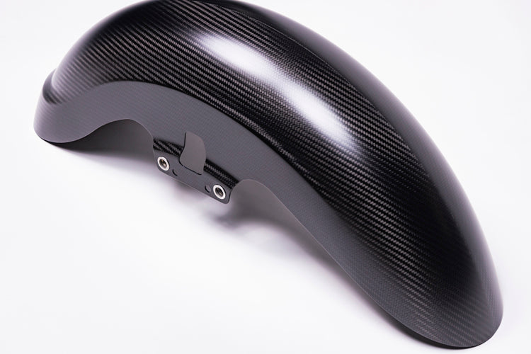 Mid-length front fender for 19 inch wheel size x 49mm Fork. SpeedKore® styled prepreg carbon material in V-weave pattern. Autoclave cured and satin clear-coat applied for UV protection.