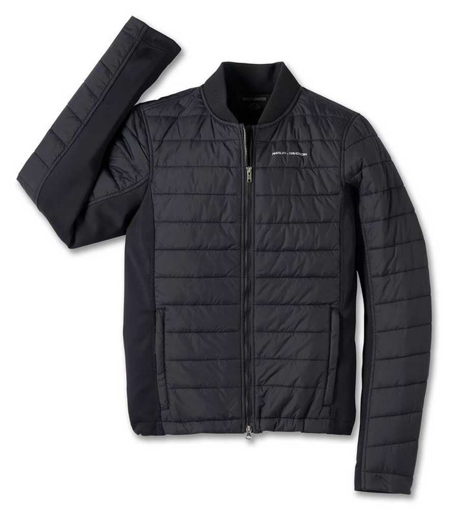 Harley-Davidson® Women's Layering System Lightweight Mid Layer Jacket - Black, 98147-23VW. It's layer two in Harley's 1-2-3 modular line that gives you interchangeable protection and style options for riding. Made with 100mg polyfill for lightweight warmth. Pre-curved sleeves. Hybrid build with fleece underarms and side panels. Made from 100% nylon (body). 91.5% polyester, 8.5% spandex fleece (side panels and underarms). 100% nylon lining. Two-way zipper front. Zippered hand-warmer pockets with a packable pocket bag included. 3M Scotchlite Reflective Material. Allover quilted styling. Rib-knit collar. 98147-23VW