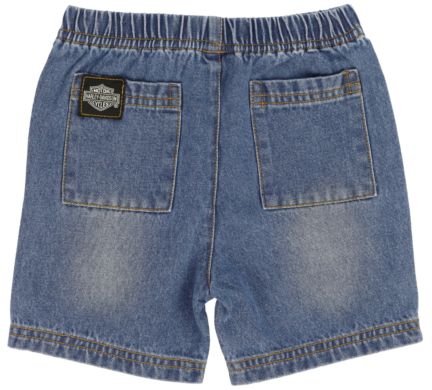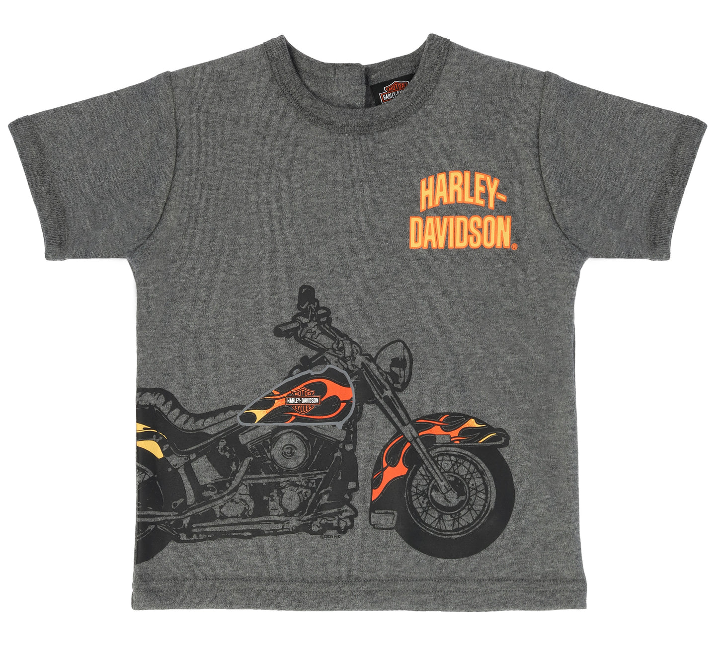 Un gran look para bebés varones, esta camiseta de punto supersuave de 2 piezas presenta un gráfico de bicicleta HD ® y se combina con un short de mezclilla azul lavado con enzimas.