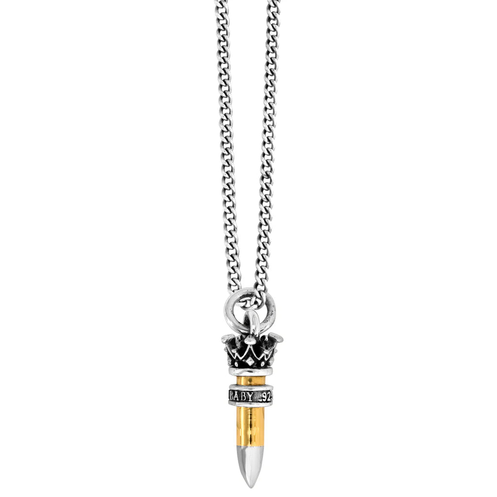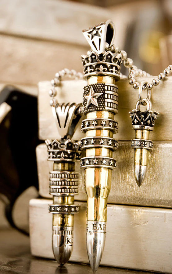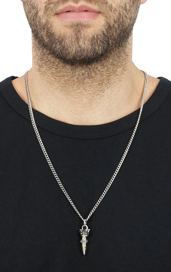 - El diseño del colgante presenta una bala de latón calibre .22 adornada con un anillo de plata y rematada con una corona.