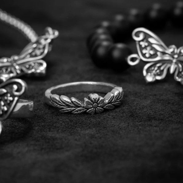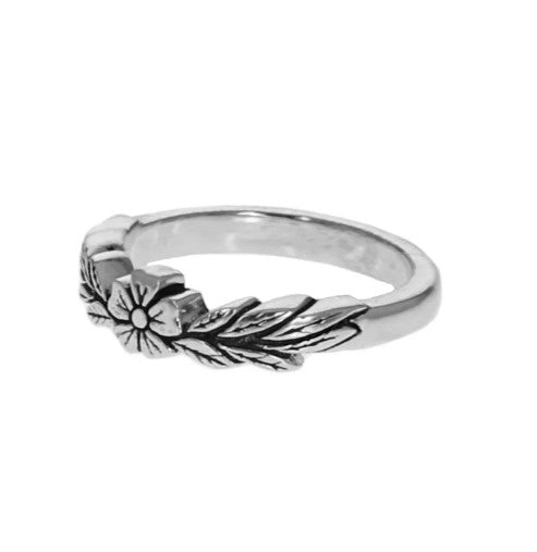 Este anillo artesanal está elaborado en plata de ley 925 de alta calidad, con una maestría artesanal. El diseño presenta una delicada flor grabada en la cara del anillo, que le aporta un toque de elegancia natural. Con una altura aproximada de 5,5 mm y una profundidad de 2,7 mm, el anillo ofrece un perfil equilibrado, sutil y sofisticado a la vez. Cada pieza se elabora a mano con esmero en EE. UU., garantizando la atención al detalle y un acabado artesanal único.