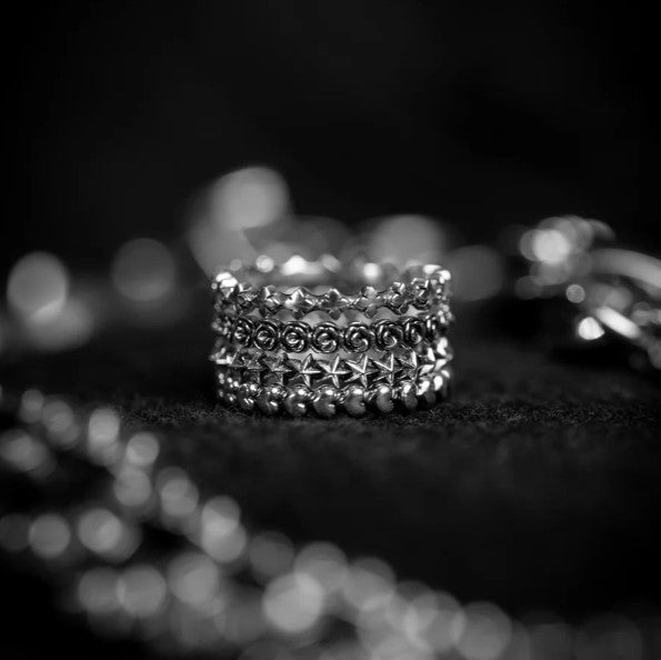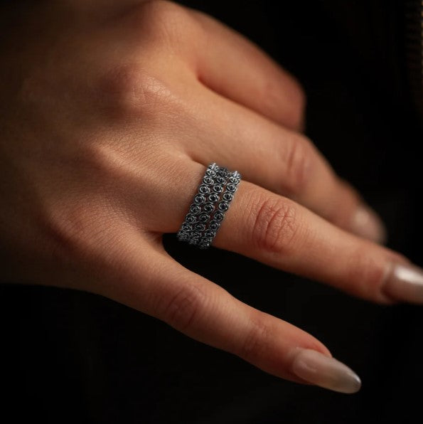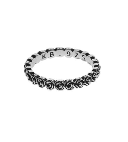 Elaborado con esmero en fina plata de ley 925, este elegante anillo presenta un diseño apilable único con pequeñas rosas 3D que rodean la banda. Ya sea que se use solo para un toque sutil o combinado con otros anillos King Baby®, es el complemento perfecto para cualquier colección. Añade esta pieza atemporal a tu joyero y combínala con otros anillos apilables King Baby® para un look personalizado.