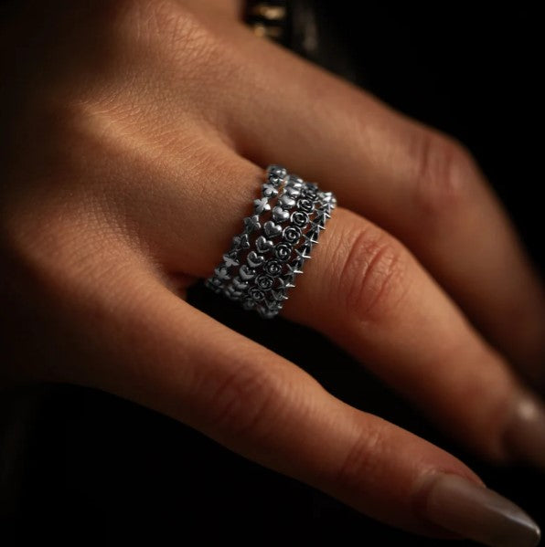 - El diseño apilable presenta pequeñas estrellas 3D que rodean la banda.