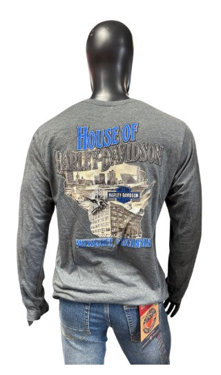 - Los gráficos impresos en esta manga larga muestran el logotipo de Police Badge® en el pecho izquierdo; mientras que nuestros gráficos personalizados en la espalda presentan The House of Harley-Davidson encabezando una colección de lugares emblemáticos de Milwaukee dentro del estado de Wisconsin, completado con la inscripción Milwaukee, WI