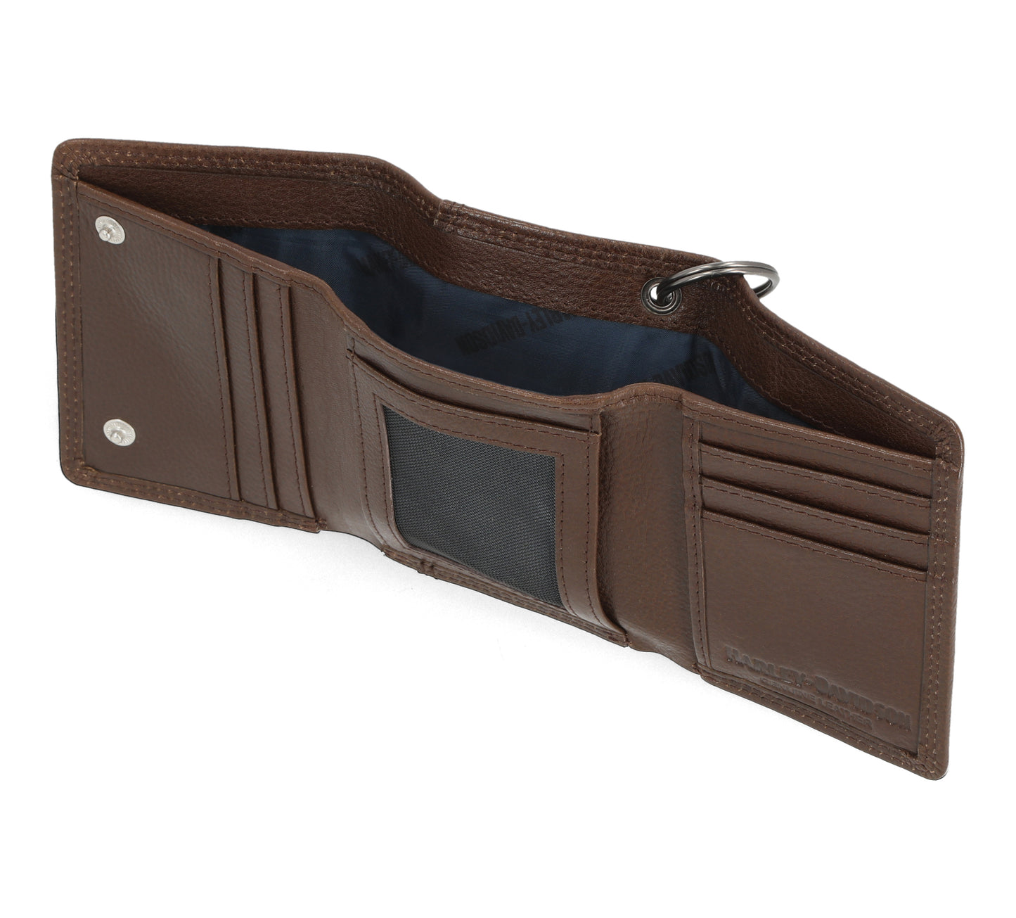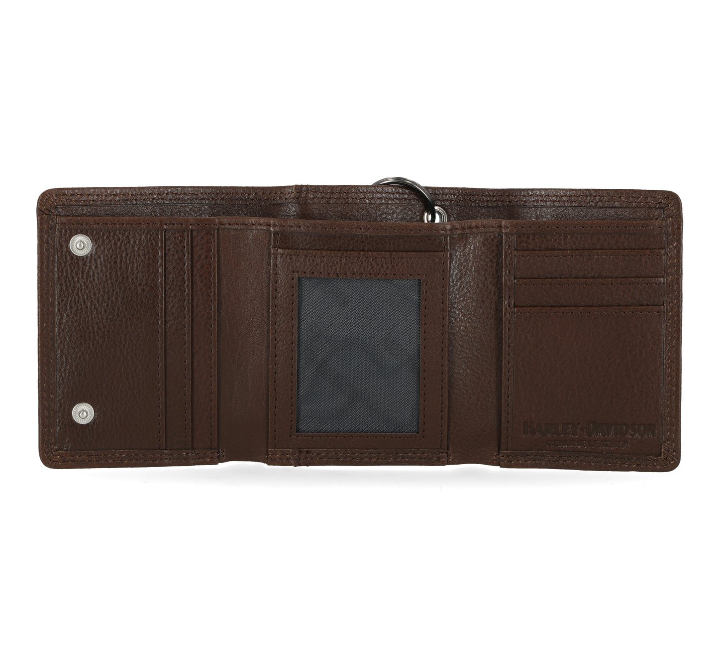 Lleva tus objetos esenciales con estilo y seguridad con la cartera Harley-Davidson® Upwinged Eagle Bar & Shield® para hombre. Elaborada en cuero genuino granulado, esta cartera de tres pliegues cuenta con una resistente cadena de metal gris plomo y protección RFID. Con el icónico logotipo grabado, esta cartera marrón ofrece amplios bolsillos para tarjetas, identificación y efectivo. ¡Renueva tu armario con este accesorio imprescindible!