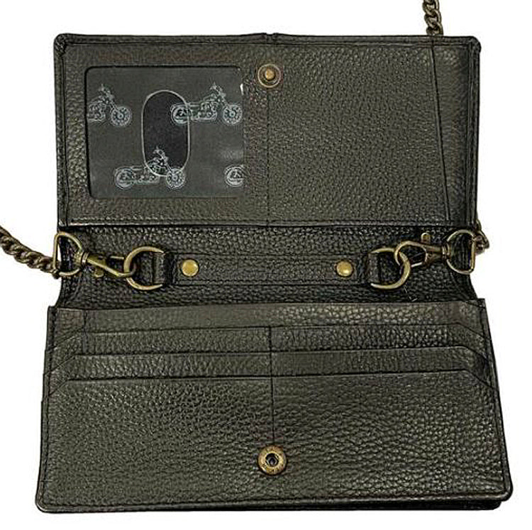 Desde la rica textura del auténtico cuero vacuno fresado hasta el detalle que define la silueta de las tachuelas planas de latón antiguo, el HD® Midnight Rider Bi-Fold Clutch ofrece un estilo clásico con el toque Harley®. La cadena desmontable y la correa de cuero te permiten llevarlo como un clutch de manos libres si viajas ligero y es todo lo que necesitas. Con un cierre oculto que asegura tus objetos de valor, este clutch se abre para revelar sus prácticas y eficientes 6 ranuras para tarjetas de crédito, una ventana para DNI y 4 bolsillos interiores. No te pierdas la ventaja adicional del monedero con cremallera en la parte trasera. Pequeño en tamaño pero con una gran funcionalidad, este clutch supera todas las expectativas. Con la placa Harley-Davidson® de latón antiguo y la lujosa sensación del forro Moto de mezcla de poliéster, este clutch bi-fold te hará vivir la vida a lo grande. Tanto si tienes un dólar de plata más como si no. Mide aproximadamente 18 cm de ancho x 10 cm de alto x 1,9 cm de profundidad. Negro. Cuero.