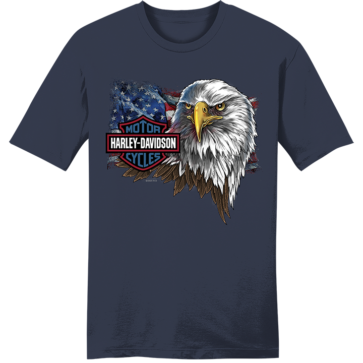 La camiseta Freedom Ride de inspiración vintage celebra el audaz espíritu estadounidense. Esta camisa índigo de manga corta para hombre luce una imponente águila calva sobre una bandera estadounidense vintage, rematada con el logotipo de Harley-Davidson Bar & Shield. En la parte posterior, un logotipo de House of Harley-Davidson con un ala estampada rinde homenaje a nuestras raíces natales en Milwaukee, EE. UU.