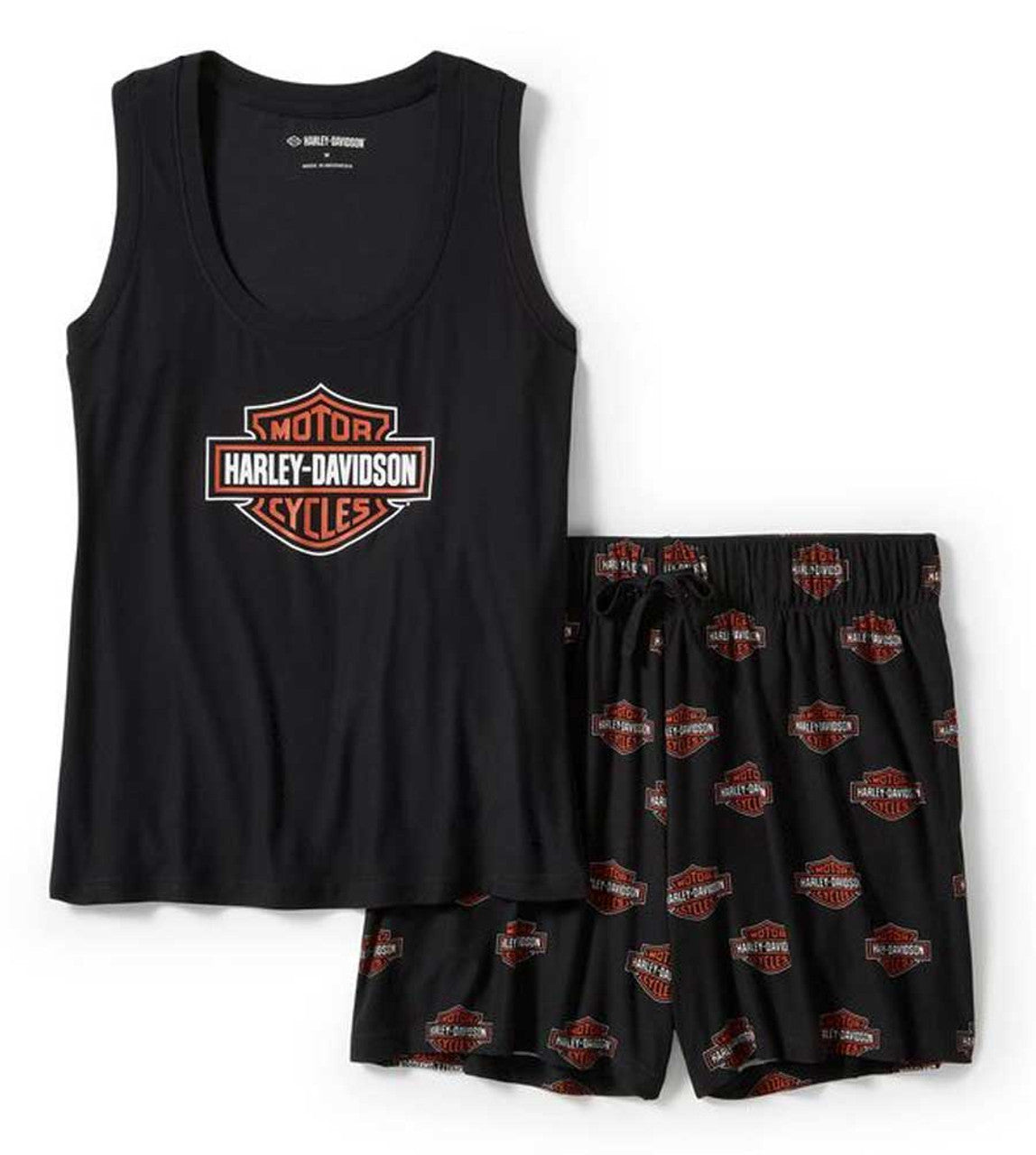 Conjunto de pijama corto con estampado de barras y escudos Harley-Davidson® para mujer, negro 96522-25VW. Confeccionado en jersey de peso medio 94 % poliéster y 6 % elastano. Cintura elástica reforzada con cordón (pantalones cortos). Ribete integrado en cuello y sisas (top). Estampado integral personalizado (pantalones cortos). Estampados suaves al tacto. Entrepierna: 7,6 cm. 96522-25VW