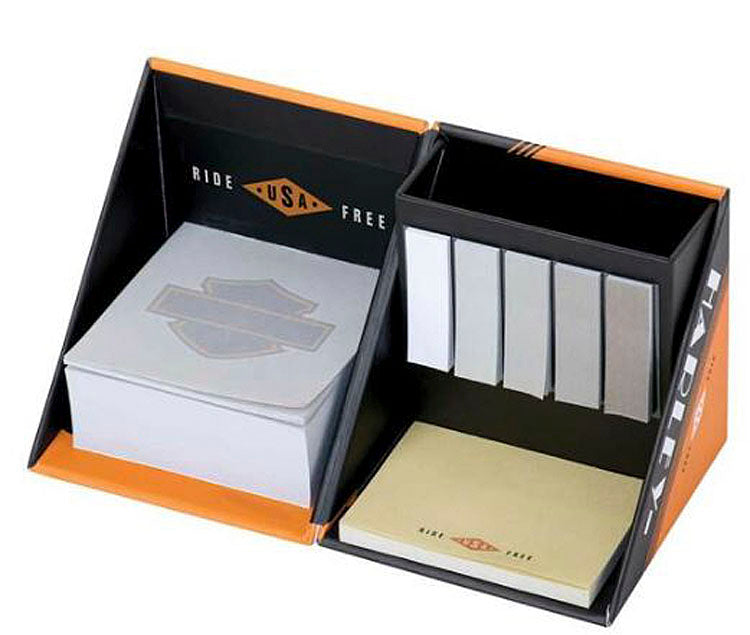 Remember to pick up the dry cleaning. Don't forget your dog's grooming appointment. Everyone needs a little reminder now and then. Leave yourself a note with the Harley-Davidson® Ride Free Note Cube. Displaying the old-school Ride Free statement with the Harley-Davidson® signature, this cube opens to reveal 300 tear away note sheets, 50 sticky notes, 100 sticky tabs, and a place to store your pens. The perfect desk accessory for the riding enthusiast! On hand for phone messages, shopping reminders and more!