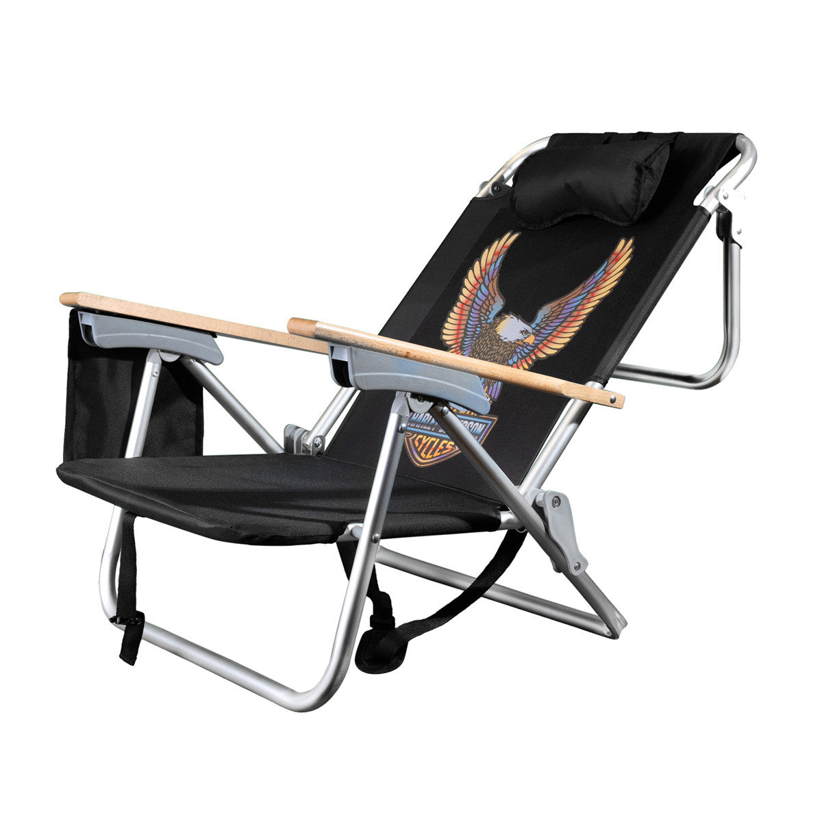 Introducing the Harley-Davidson® Vivid Bar & Shield® Eagle Beach Chair! Featuring a sturdy and adjustable steel frame with wooden handles and cup holders for maximum comfort and convenience. The black 600 Denier polyester material is both durable and stylish, adorned with the iconic Vivid Bar & Shield® Eagle graphic. Relax in style with the added backrest pillow and easily transport your chair with the included carry strap. Whether folded or open, this chair is the perfect addition to any beach day.