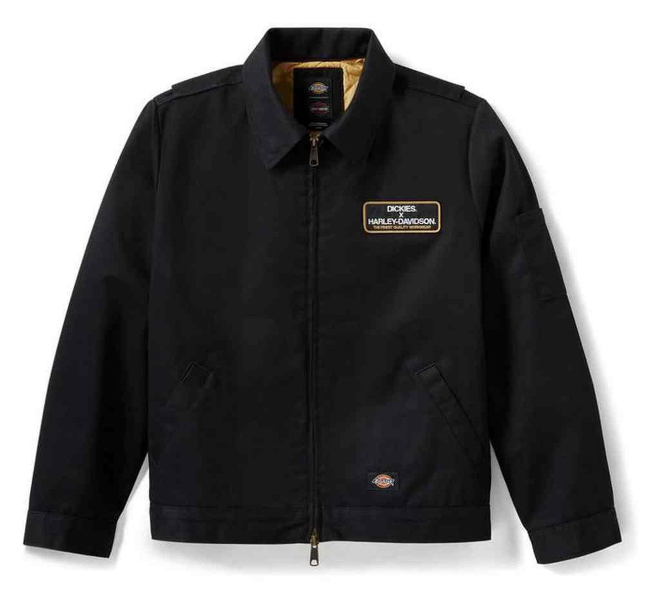 Harley-Davidson® Women's Dickies Quilted Lined Eisenhower Jacket, Black 97429-25VW. Regular fit. Action back. Pre-curved sleeves. Made from 65% polyester and 35% cotton heavyweight twill. 100% nylon quilted taffeta lining. Poly fill. Two-way zipper front. Adjustable snap cuffs and waistband. Pencil pocket on left sleeve. Slant welt hand-warmer pockets with hidden snap closure. Hidden snap-down collar. Contrast diamond quilted lining. Embroidered twill patch. Felt patch with chenille and chain stitch. Co-branded labels. 97429-25VW