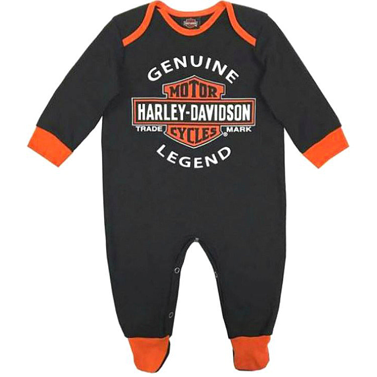 From his earliest wiggles 'til his first successful turn-over, your infant boy will enjoy the soothing comfort of the all-natural cotton interlock weave used to construct the H-D® Footed Interlock Coverall. And, the skosh of stretch helps, too. Reminiscent of the unmistakable Motor Oil Can Label, this coverall features the Long Bar & Shield® logo encircled with the Genuine Legend script. Welcome your future rider to the Harley® family, and enjoy the (parenthood) ride. Newborn and Infant sizes. Black. Cotton. SGI Apparel. Imported. 3050911