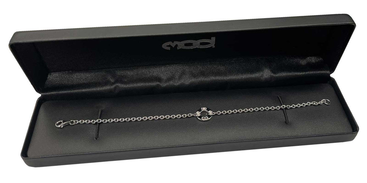 Sterling silver setting features the Cirque Collection round charm center-point with a Bar & Shield® graphic, complemented by a delicate chain. Handcrafted elegance secured with a sturdy lobster-claw clasp. Available in two sizes: measuring approximately 7.0" long, or measuring approximately 7.5" long. MOD® Jewelry. HDB0472