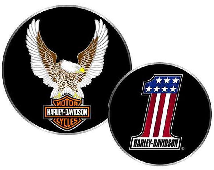 Collectors have long recognized coins as a valid and valued keepsake. And, in celebrating your affiliation with the best bike on two wheels, the H-D® #1 Logo Upwinged Eagle Challenge Coin displays your perspective on liberty and freedom on the open road. The imagery on this coin starts with the #1 Stars & Bars Logo, employing an abbreviated expression of Old Glory and the Harley-Davidson® signature on one side, along with the glorious Upwinged Bald Eagle perched atop the iconic Bar & Shield® on the other. The merging of your patriotism and your lifestyle passion come to life in a high quality collectible token. Measures approximately 1.75" in diameter. Multi-Color. Metal. SymbolArts®