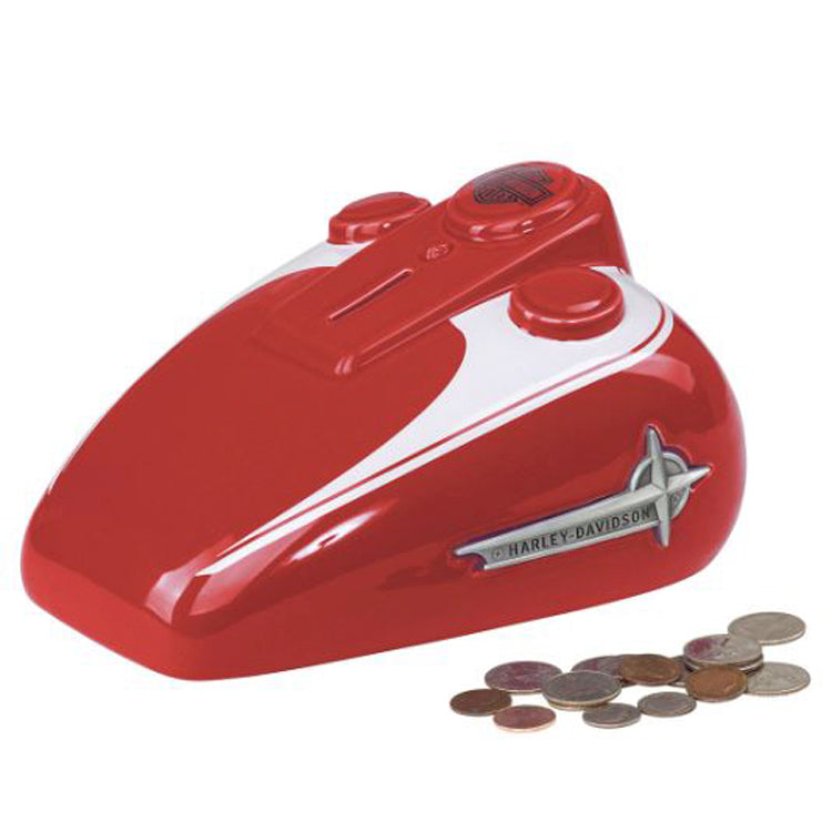 Like the song says, Change'll do you good. Especially when you save your change in the H-D® 1962 Retro Gas Tank Bank. The striking red ceramic bank features a 1962 classic Harley-Davidson® tank graphic on both sides, along with a removable stopper. The custom-tooled 1962 tank medallion adds realism and authenticity, and also appears on both sides. Decorative and functional, this bank will put you on the road to a nice nest-egg. Especially when you add some folding money into the mix. Do yourself some good, and you'll have something to sing about. Measures approximately 8.5"L x 7"W x 4.8"H. Red with white tank graphics and silver-tone medallion detail. Ceramic.