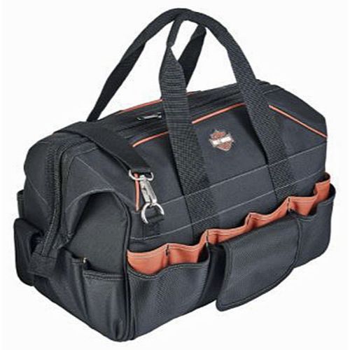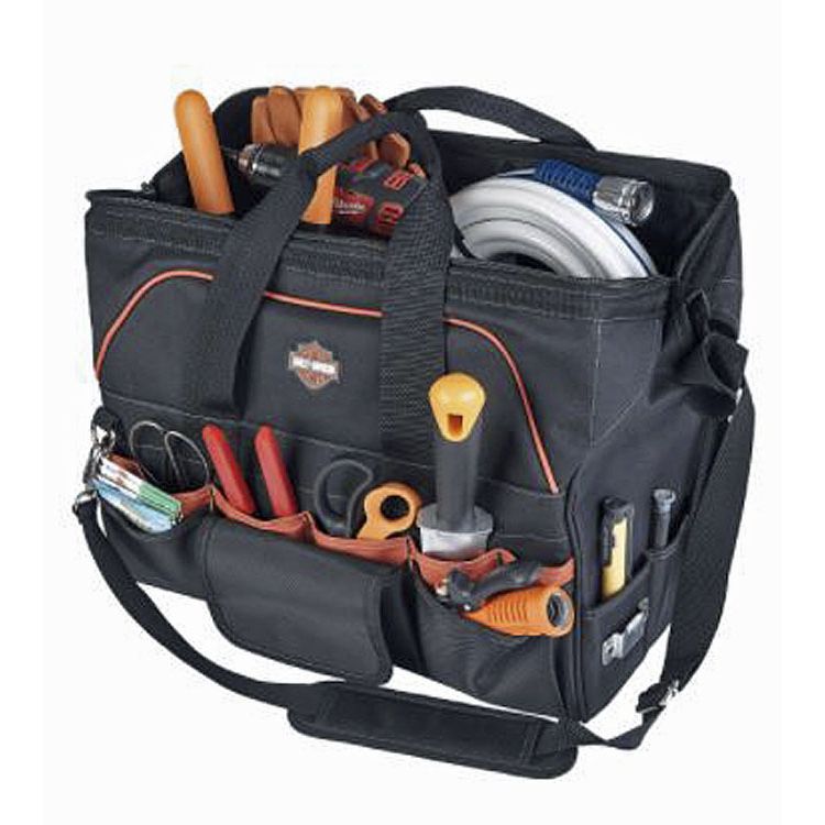Have tools will travel. Tackle that project list when you get organized and ready with the H-D® 39-Pocket Tool Bag. From the industrial-strength construction to the heavy-duty zippers, and from the generous 14 interior & 25 exterior pockets to the sturdy rubber feet, this super-strong Tool Bag puts you on the path to getting the job done. The dual-pull zipper and metal hinge frame deliver an extra-wide opening to the main compartment. And, the detachable/adjustable shoulder strap with comfort padding gives you a hands-free carrying option. Functional, versatile, rugged Harley® quality.