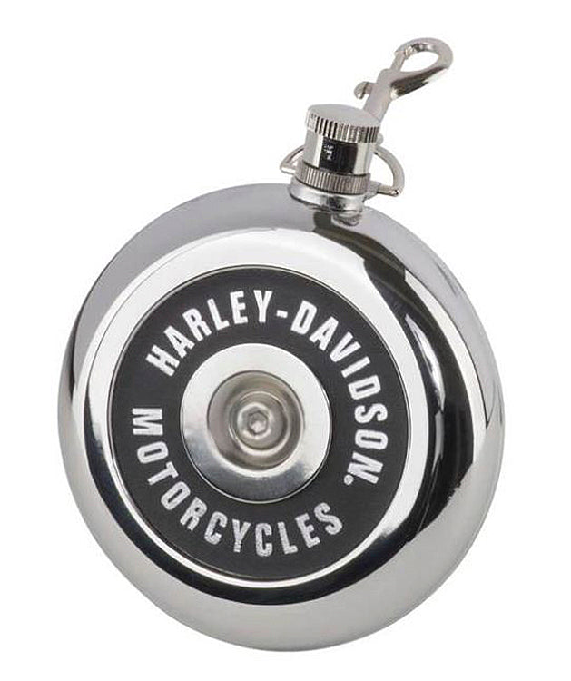 Take your spirits with you in the portable potable H-D® Air Cleaner Style Round Flask.