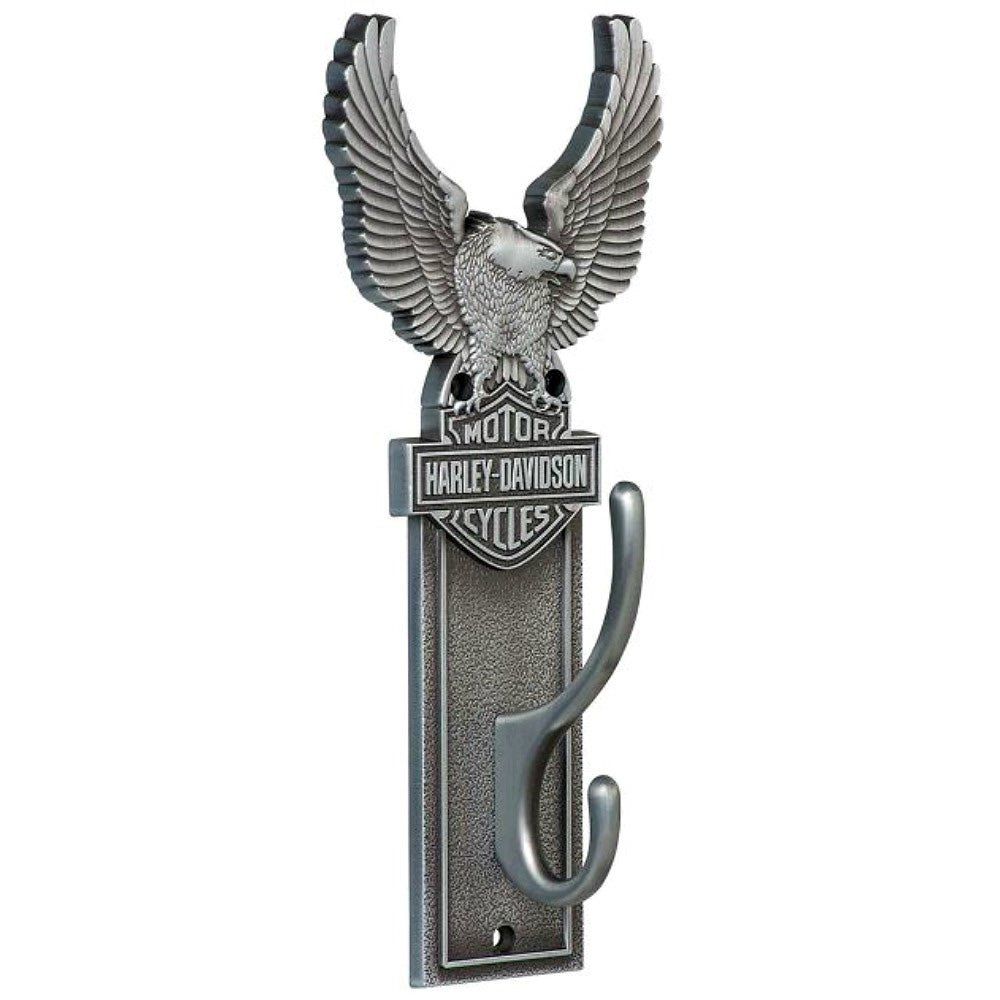 Home is where you hang your hat. With the H-D® Antique Pewter Eagle Coat Hook, you're home. The double-hook construction gives you a place for your jacket and hat -- perfect for a mud room, or garage entry-way. Made from heavy duty zinc cast with a fade-resistant, hand-polished antique pewter finish, this coat hook features the glorious upwinged eagle atop the iconic Bar & Shield®. Now that's an authentic Harley® welcome home. Mounting hardware included. Measures 4"W x 9.25"H x 2.25"D.
