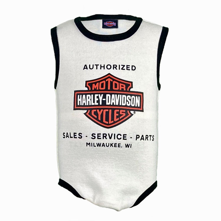 3-snap closure at the bottom - White creeper with black trim at neckline, arm & leg openings features the Authorized Sales, Service, Parts script framing a large Bar & Shield® logo, with the Milwaukee, WI locator on the front; while the solid color olive green creeper includes tone-on-tone trim at the neckline, arm & leg openings and displays the inspiring upwinged eagle perched atop the Bar & Shield® logo on the front