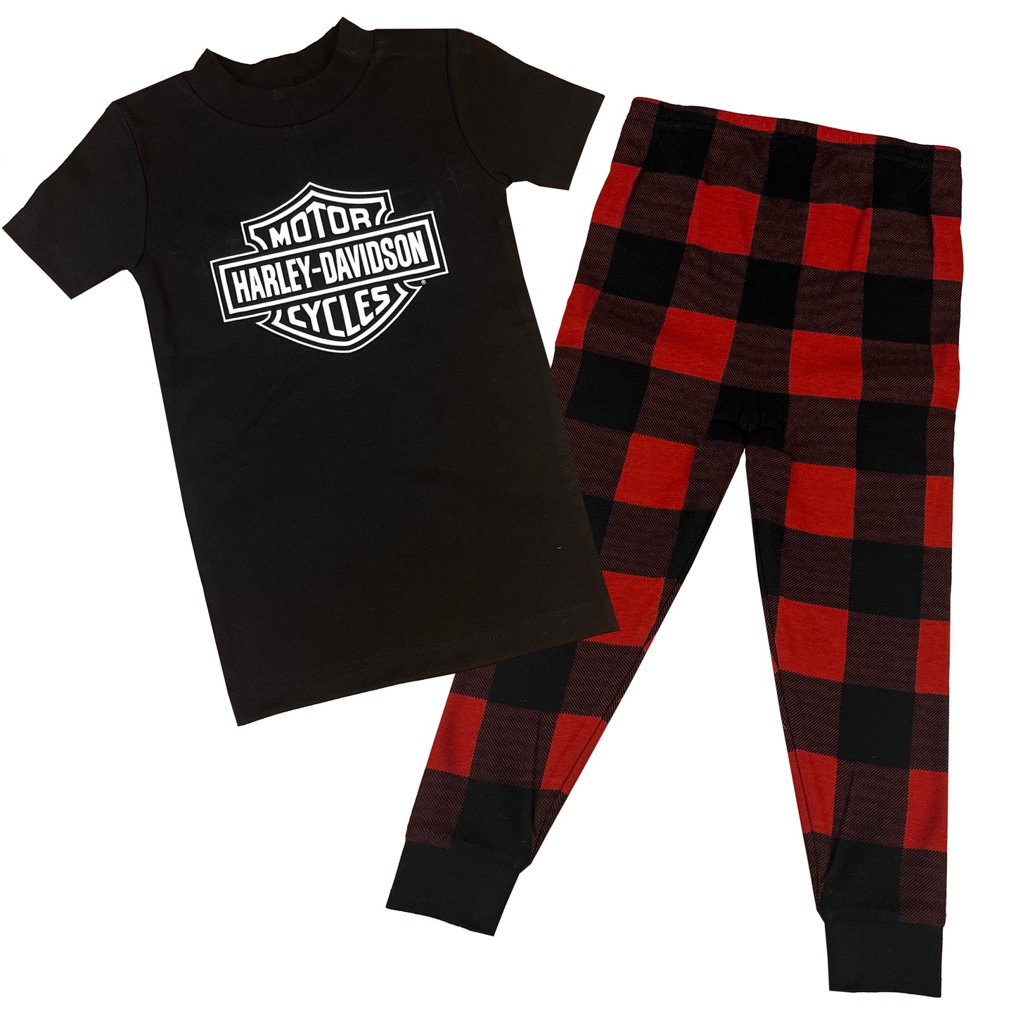 Get your little one ready for the holidays with our Harley-Davidson® Toddler & Big Boys' Holiday Plaid Pajama Gift Set. Made with a comfy and soft cotton/polyester blend, this set is perfect for cozy nights. The crew neckline with piping ensures shape retention, while the black top features the iconic Bar & Shield logo. The red and black plaid pants complete the festive look.