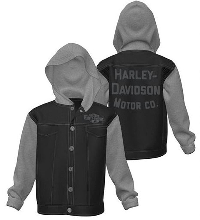 Take in this classic combo of mixed media with the H-D® Denim & Fleece Hooded Jacket. Made from an all natural cotton denim shell with cozy cotton/polyester blend fleece sleeves and slouchy hood, this casual jacket will fend off any complaints about wearing a jacket. The snap-front closure presents a very grown up look, making it a must-have for the boys who want to be just like Dad. The printed graphics display the long Bar & Shield® logo on the front and the Harley-Davidson® Motor Co. signature on the back. Toddler, Little Boy and Big Boy sizes. Black/Grey. Cotton & Cotton/Polyester. SGI Apparel. Imported. 6070213 6080213 6090213
