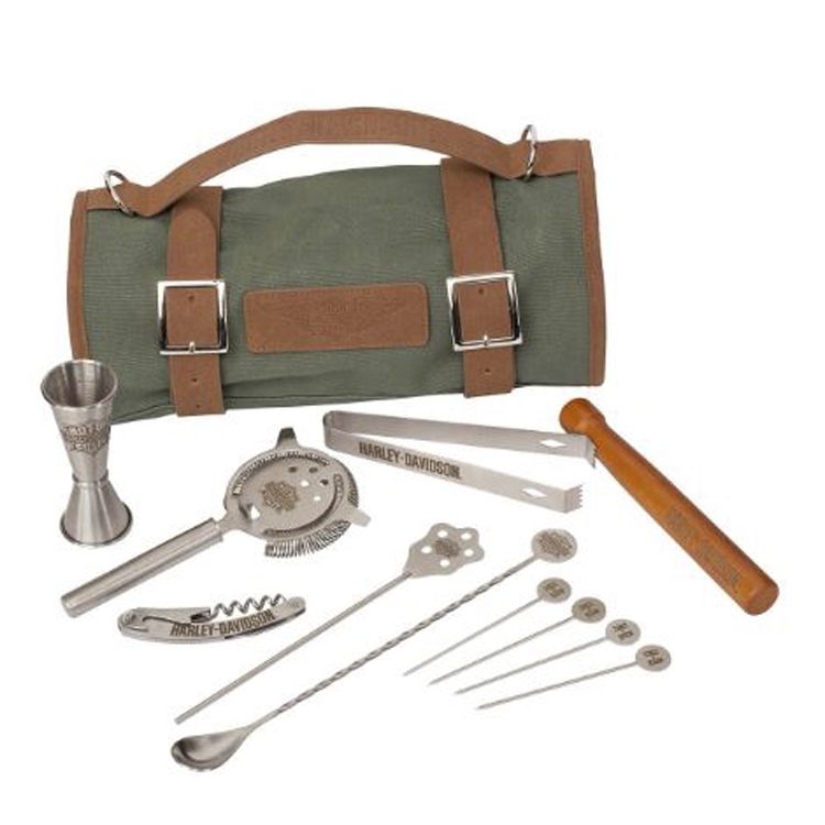 Give your vacation a bartender-friendly set up with the H-D® Cocktail Travel Kit. Ready to go in a durable canvas carry case, including the embossed Winged Bar & Shield® on the front and the Harley-Davidson® signature on the carry handle. This kit will have you mixing like a pro in no time, with everything from a Bottle Opener, a Strainer, a Jigger, Tongs, a Wood Muddler, a Swizzle Stick, a Long Stir Spoon and four Cocktail Picks. The canvas case provides secure positions for each and rolls up to be self-contained with two buckle-strap closures. So, whether you're camping, on the beach or in an Airbnb, you'll have everything you need to stir up some fun. Ace Products Management Group