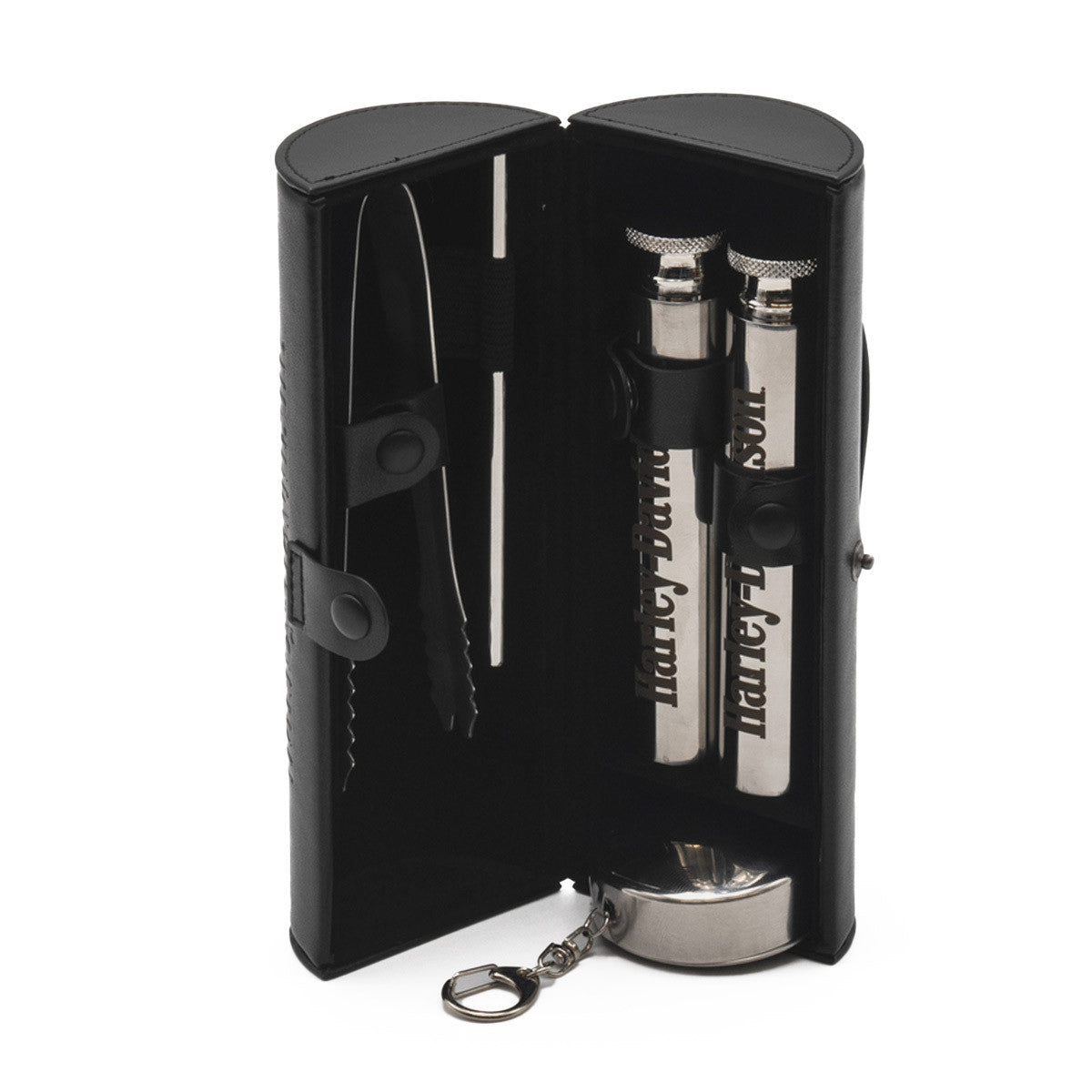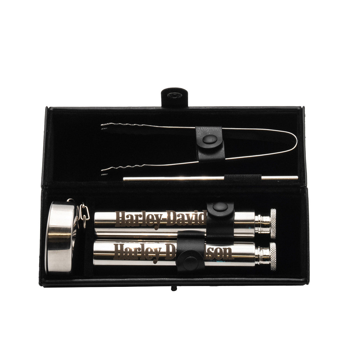 Give your vacation a bartender-friendly setup with the H-D® Bar & Shield® Eagle Travel Bar Set. Ready to go in a durable, faux leather carry case branded with the embossed Harley-Davidson® signature, this kit will keep your tools secure. With everything from two one-ounce flasks, a 2-ounce collapsible shot glass, tongs, and a straw, you will have everything you need to share a shot with a friend after a long ride. Ace Products Management Group