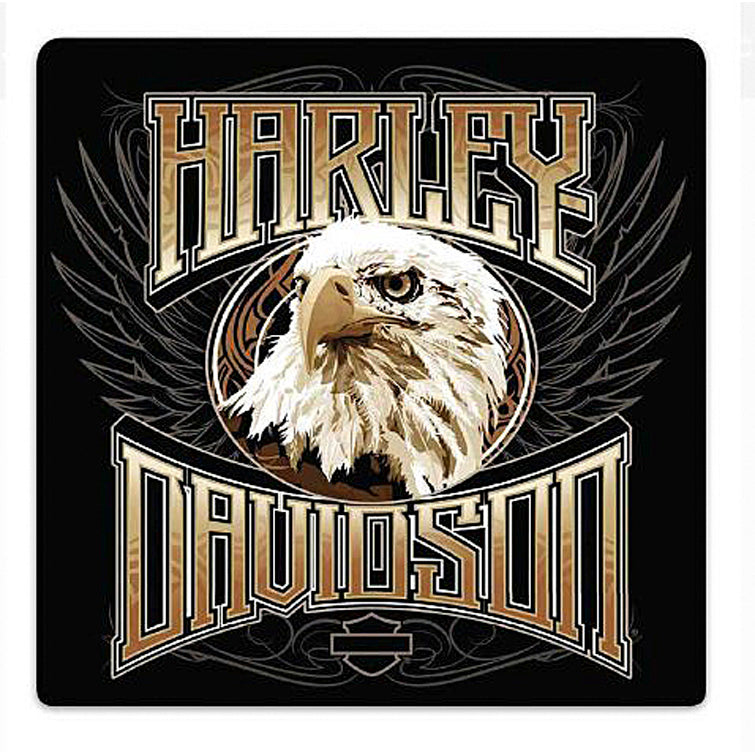 The look in the eyes shows intense focus in the H-D® Eagle Stare Embossed Tin Sign -- featuring the fierce and the fabulous. Made from die-cut tin, this embossed sign displays the H-D® signature script in a powerful graphic, complemented by the image of an eagle, illustrated wings and the Bar & Shield® silhouette. Add this magnificent sign to your mud room, man cave or garage workspace and provide your fellow riders an atmosphere where they can soar. Convenient pre-drilled holes allow for quick & easy display. Measures approximately 14.5" square. Black/Multi-Color. Tin. Ande Rooney, Inc. Made in the USA.