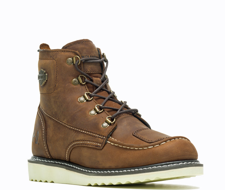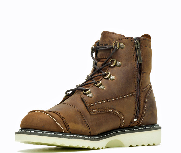 When being on the road makes you feel right at home, your gear should reflect the styling and confidence of an outdoorsman. So consider the benefits of the H-D® Hagerman Motorcycle Riding Boots, and look the part on your bike. Made with a full-grain leather upper and a full-length mesh lining for dependable durability and comfort -- plus the contrasting stitching and a reinforced shifting pad across the toes to minimize wear from shifting gears -- for modern, functional purpose. Paired with the durable and light-weight polyurethane outsole and Goodyear® welt construction, this riding boot puts sure footing in your wheelhouse. And, the YKK® locking inside zipper works with the convenient pull-on tab at the back of the boot for an easy on/off experience. Generous design details amplify your loyalty to the brand quality, including the Harley-Davidson® script at the top of the tongue, the abbreviated H-D® signature on the outside heel and the metal Bar & Shield® on the outside ankle. Keep your edge in this modern-moto silhouette with performance you can rely on. Shaft height 5.5". Heel height 1". Scrubland Brown. Leather. Wolverine. D93470