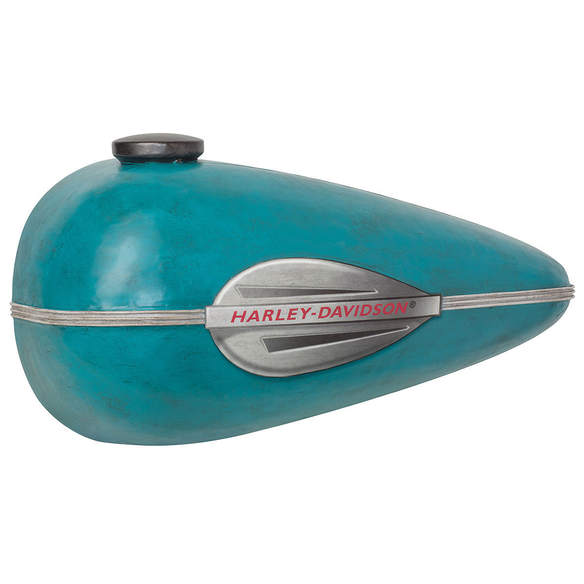 Introducing the Harley-Davidson® Gas Tank Metal Wall Art - a beautifully crafted scale model with a distressed finish, showcasing an iconic tank emblem medallion. Measuring 20.25" in length and 9.75" in height, this unique piece adds a touch of vintage charm to any space.