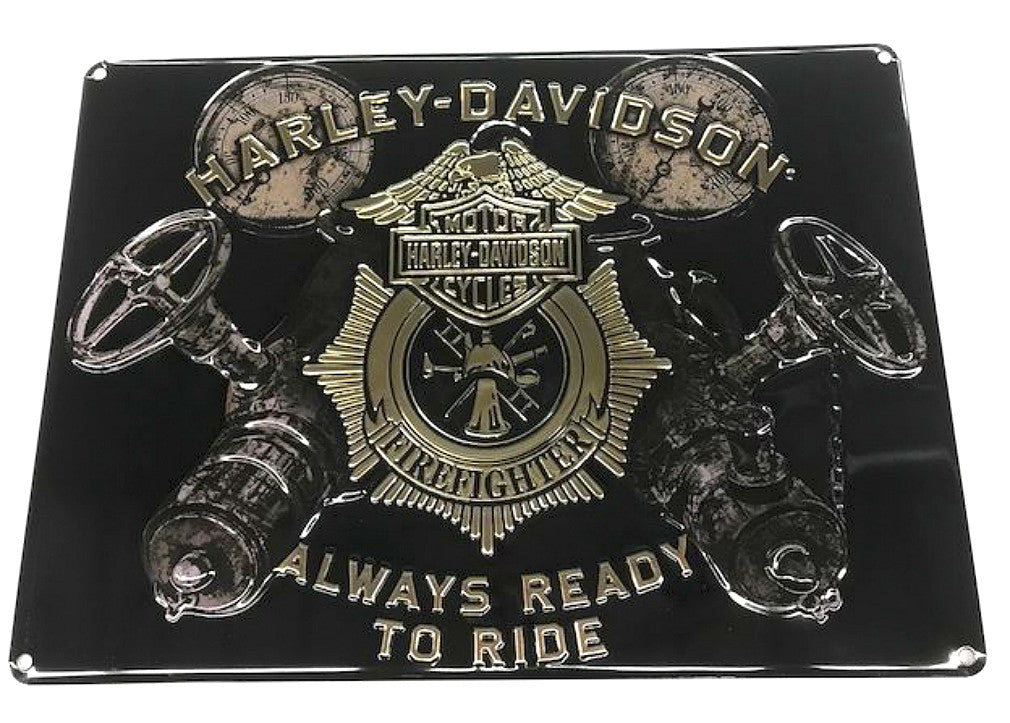 The reflective surface of the H-D® Gauges Firefighter Embossed Tin Sign draws you in to the display of gauges and water hook-ups with the pronounced Harley-Davidson® signature script above the eagle-decorated Bar & Shield® logo. With the Firefighter Badge as the focal point, you can sense the pride and the dedication. This tribute to first-responding firefighters features a mantra that they share with riders: Always Ready To Ride. Living in the communities they serve, our brave firefighters deserve the support symbolized by this striking sign. Add it to your home and show the depth of your pride and support. Includes pre-drilled holes for quick & easy display. Measures approximately 17"W x 12.5"H. Reflective Black. Tin. Ande Rooney, Inc. Made in the USA.