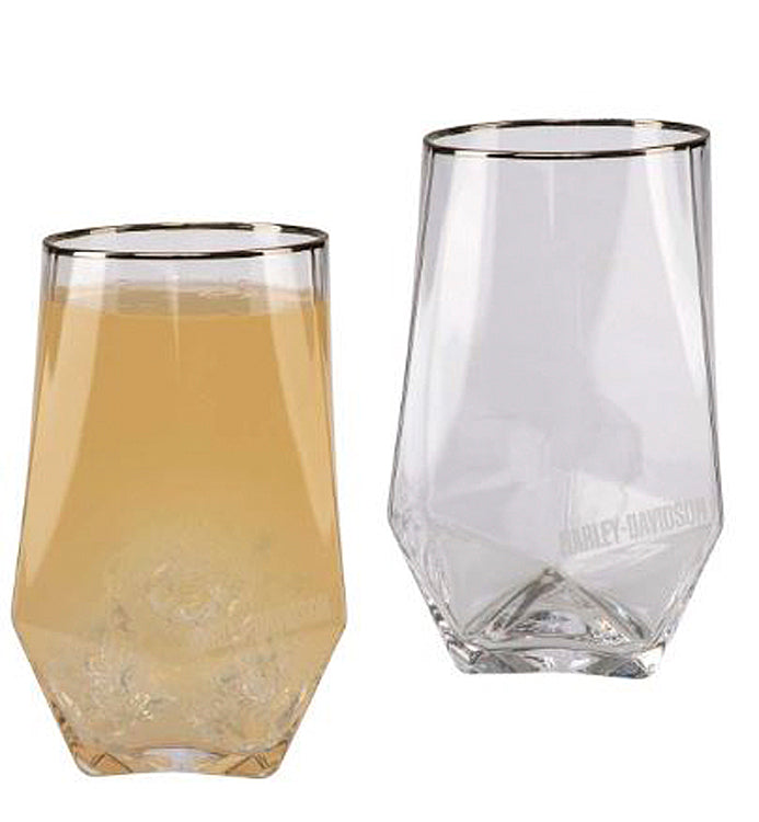 With the custom geometric shape, with the metallic silver-tone trim and with the etched Harley-Davidson® name, the H-D® Geometric Highball Set offers a lifestyle expression for an intimate toast. This set of two 18-oz. glasses provides a delightful service for your blend of top-shelf liquor and your favorite mixer with your favorite enthusiast. Hand wash only. Do not microwave. Each glass holds approximately 18 fluid ounces. Glass.