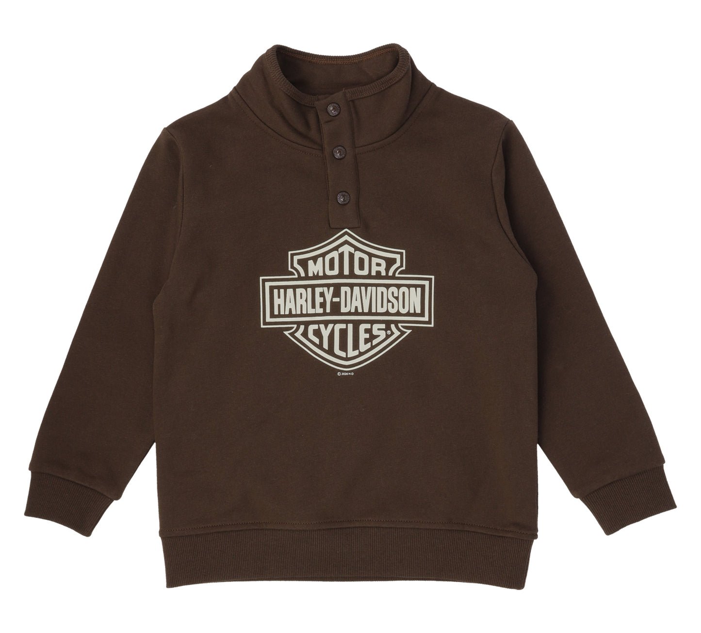 Dress your little biker in style with this Harley-Davidson® fleece pullover. Made with a light-weight and durable cotton/polyester blend, it's perfect for playtime. Featuring the iconic Bar & Shield® logo and rib-knit trim for shape retention. Available in classic brown. Rev up your child's wardrobe today!
