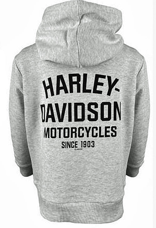 You won't have to ask twice to put on a jacket, when you add the H-D® Long Bar & Shield® Pullover Hoodie to their casual gear. Add a light-weight layer that won't inhibit their fun with this relaxed completer piece. Made from a soft and resilient cotton/polyester blend french terry, this pullover includes a kid-friendly NO-drawstrings slouchy hood and a large kangaroo pouch pocket on the front. The printed graphics on the front display an old-school Long Bar & Shield logo, while the back includes the Harley-Davidson® Motorcycles brand ID followed by the Since 1903 anniversary dateline. This is the jacket they'll want to wear -- and probably won't take of when they come indoors! Toddler, Little Kid and Big Kid sizes. Mottled Grey. Cotton/Polyester. SGI Apparel. Imported. 6570215 6580215 6590215