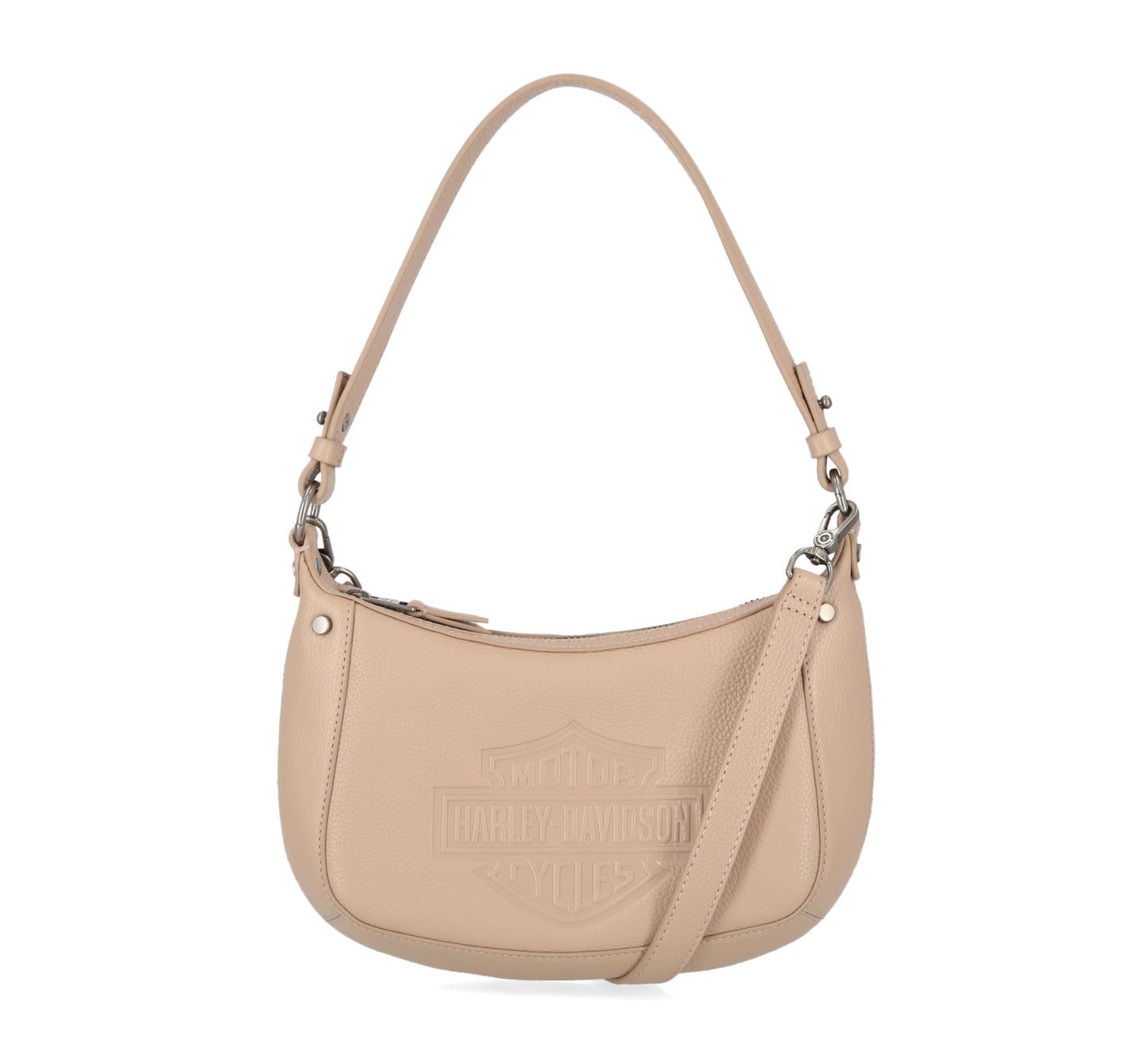 Get ready to hit the road in style with the Harley-Davidson® Flat Stud Bobo Handbag in brush! Made from high-quality pebble leather, this handbag features antique nickel findings, flat studs, and a direct heat embossed Bar & Shield® logo. With multiple pockets and adjustable strap options, it's the perfect accessory for any risk-taking, adventurous soul! Measures 9.5" x 8" x 3".